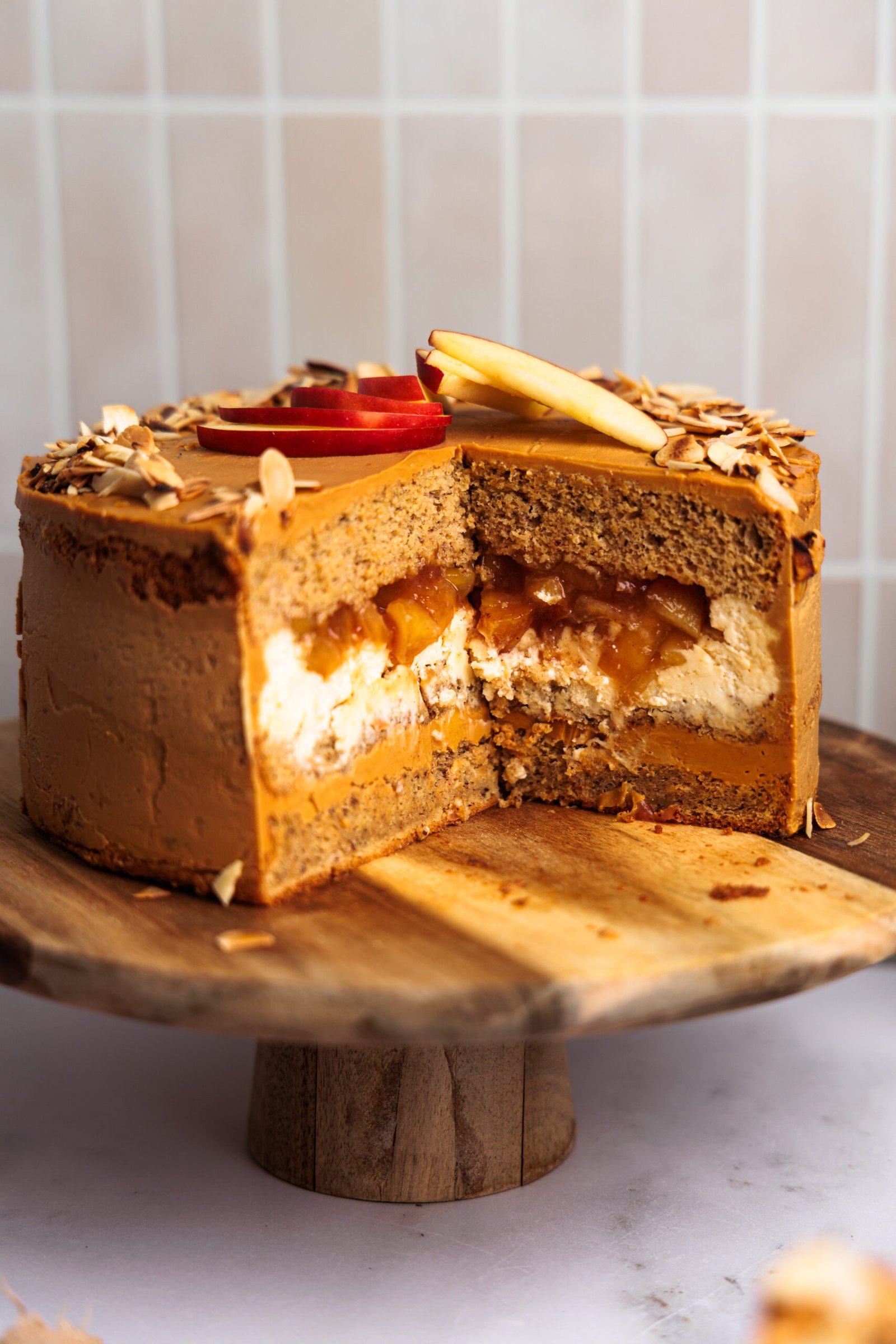 Zostavovanie torty je rovnako kreatívne ako jej chuť. Prvý korpus potrieme vrstvou karamelového krému. Naň položíme druhý korpus a nanesieme mascarpone krém, ktorým zároveň vytvoríme zvýšený okraj. Do tohto ovocného „hniezda“ vložíme vychladené karamelizované jablká a všetko zakryjeme posledným plátom cesta. Celú tortu potom potrieme zvyšným karamelovým krémom – po bokoch aj na vrchu.