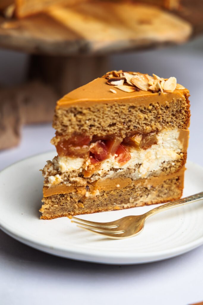• Celú tortu potrieme zvyšným karamelovým krémom, aj po bokoch aj na vrchu. Na dekoráciu si opečieme mandľové lupienky na suchej panvici dozlatista a posypeme nimi vrch torty. Pridáme aj čerstvé alebo sušené plátky jabĺk, môžeme ozdobiť aj škoricovými tyčinkami alebo trochou karamelovej omáčky.